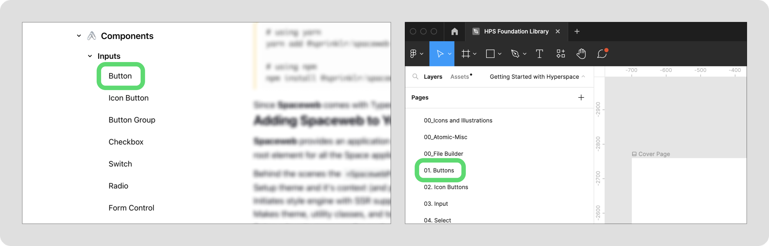 Following a similar model to Brad Frost’s Atomic Design, we modeled our Figma structure similarly and built all smaller components into its own library. Pages inside of the Atomic Figma were semantically named to also match the internal repository site, creating parity between Figma and code.